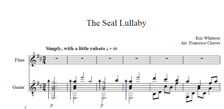 Arrangement for Guitar and Flute/Clarinet Bb / Alto sax in Eb of the song Seal Lullaby by Eric whitacre