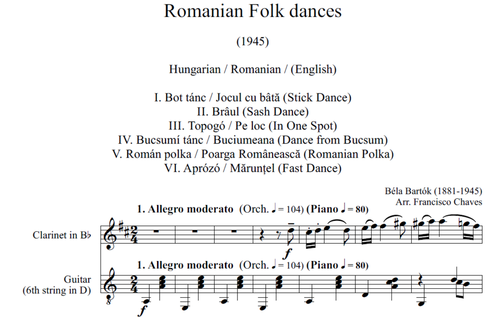 PDF for clarinet Bb and guitar of Romanian Folk dances by Béla Bartók.